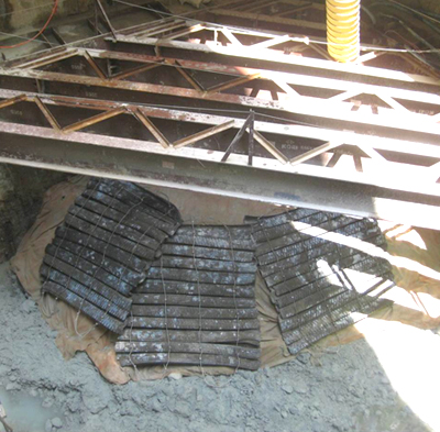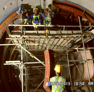 Before constructing a Cross Passage or a Pump Sump, a steel bracing has to be installed to support the bored tunnel at the location where the segment will be removed. A ring beam has the diameter of the bored tunnel but can vary in thickness and span. Usually rings beams consist of five rings that are erected at the same time and jointed together by cross beams. An opening is available at the CP or PS location for removing the segment and accessing in to the proposed structure. Erecting a ring beam requires experienced personnel as working at height and lifting of heavy beams in a confined space can cause accidents.