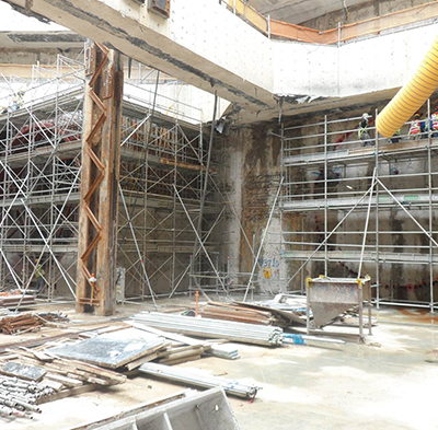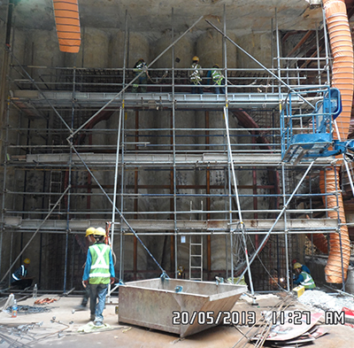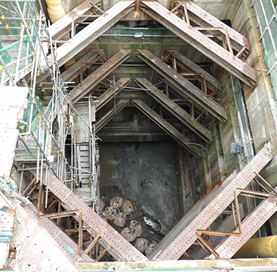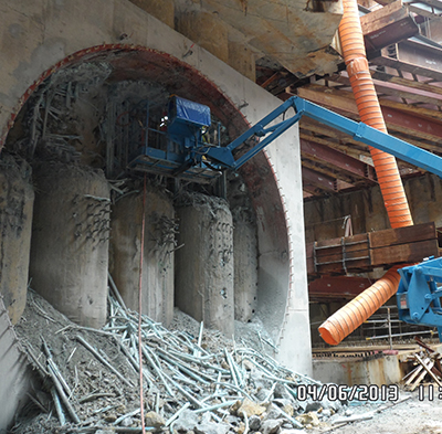 Once the formation level is reached in a station box, the location where the TBM will start the journey will be marked. However, the ERSS structure is still in the way and has to be demolished to facilitate the launch. A tunnel eye is a demolition job that usually requires to demolish a 1.2m thick heavily reinforced wall and assess the ground conditions behind it before the TBM launch or retrieval. Demolition works can be done mechanical or even manually depending on site conditions.
